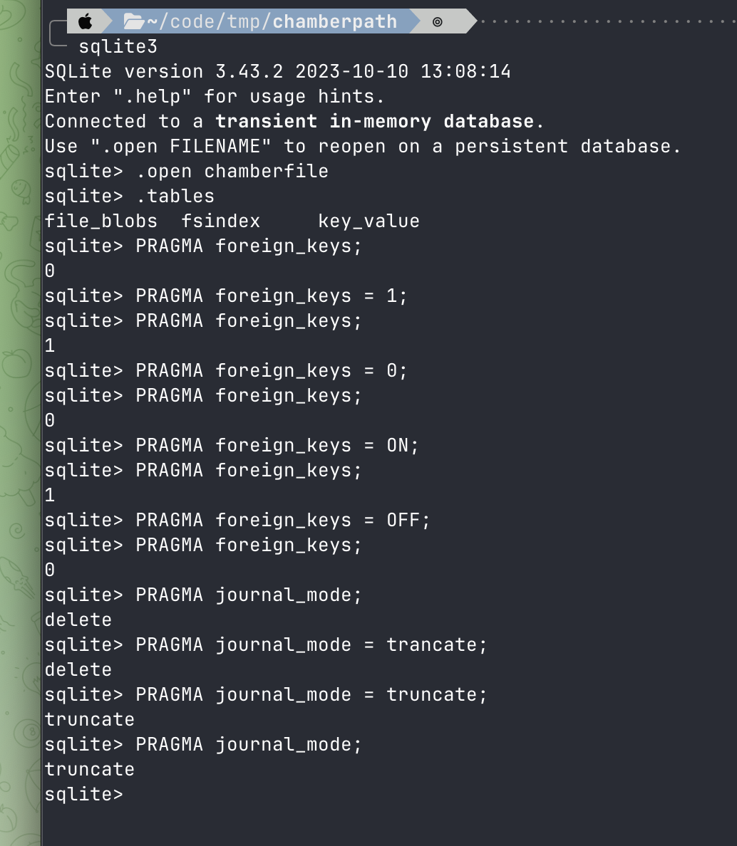 If you followed my videos on Chamber, you know that I was keeping the chamberfile in that location ~/code/tmp/chamberpath. You can see me opening the file with .open command and I am showing the tables contained in the database using the .tables command. The PRAGMA dance follows after that.